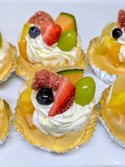 スポンジと生クリームの上にプリンとフルーツがのっています。 -