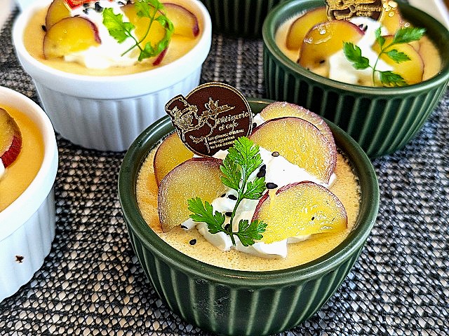 濃厚さつまいもプリンの上に秋の味覚を合わせた