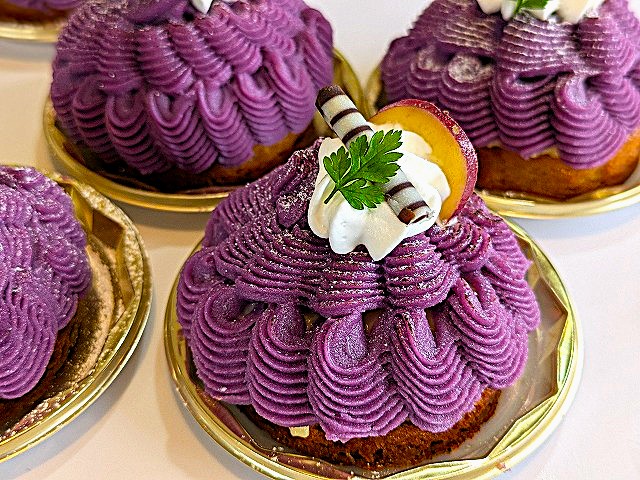 焼いたお芋ペースト、カスタードクリーム、生クリームに紫いものクリームを絞っています。 -