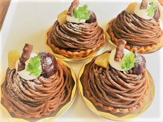 タルトの上に、生クリームとココアのスポンジ、カスタードクリーム、渋皮付きマロンクリームを絞っています。