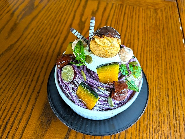 濃厚さつまいもプリンの上に秋の味覚を合わせた